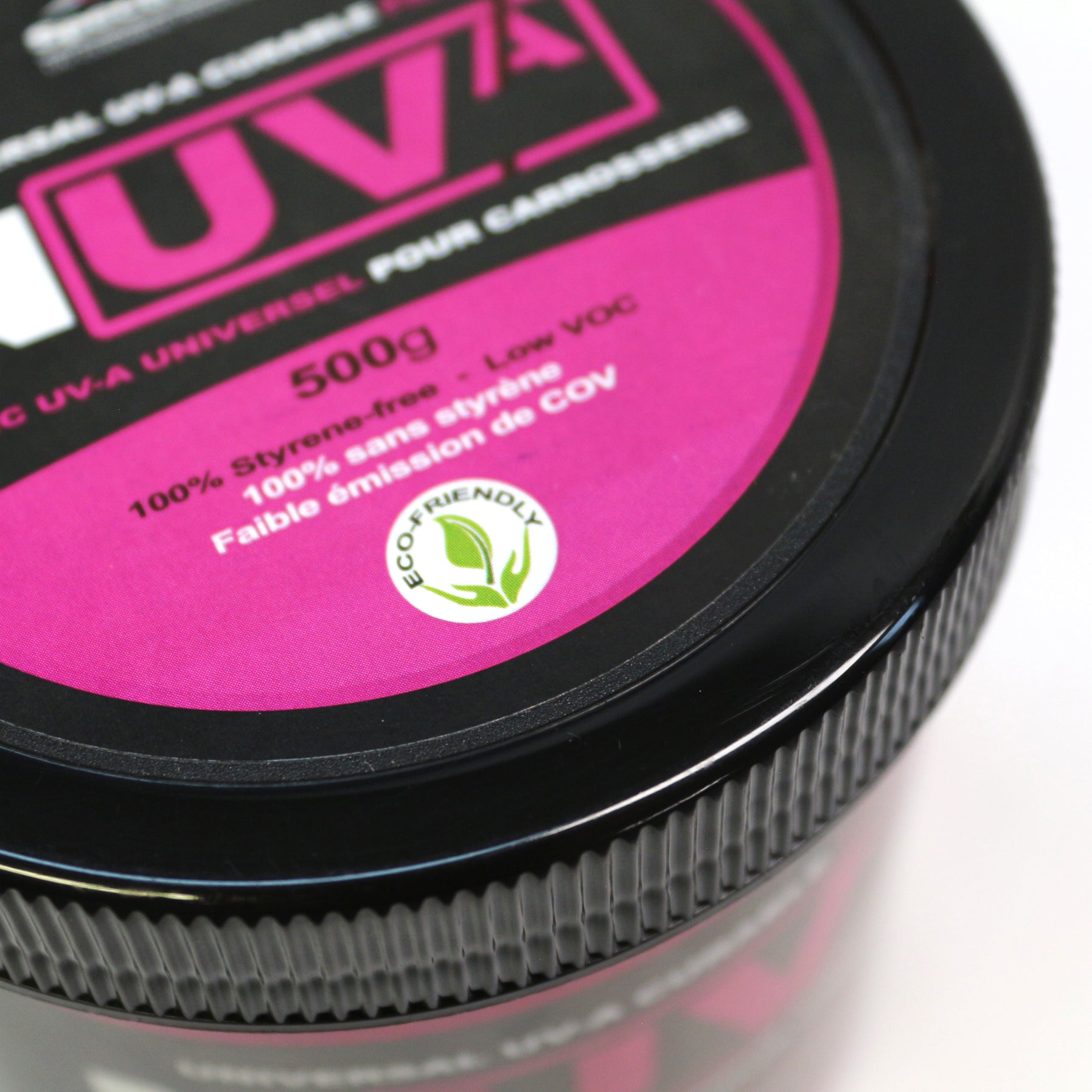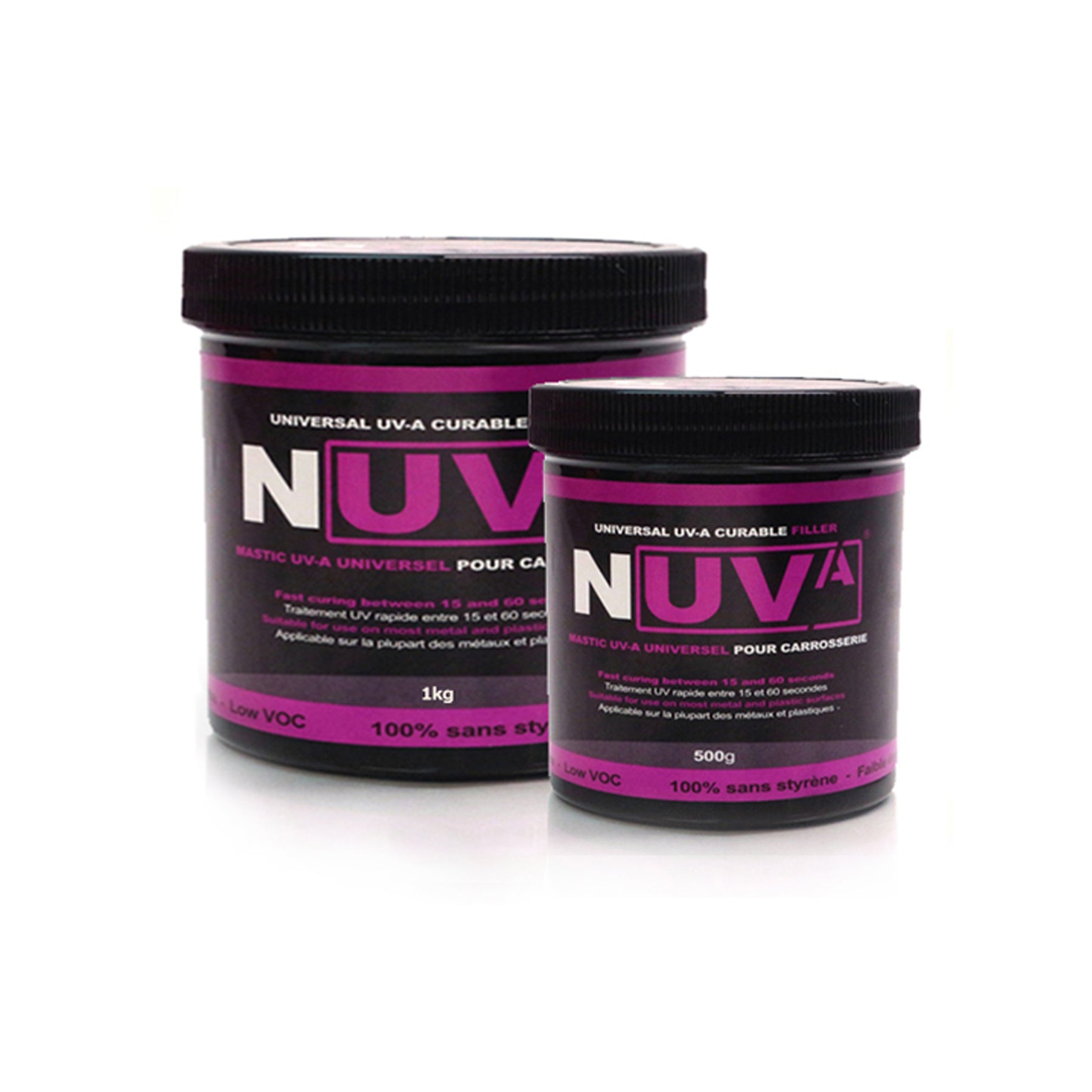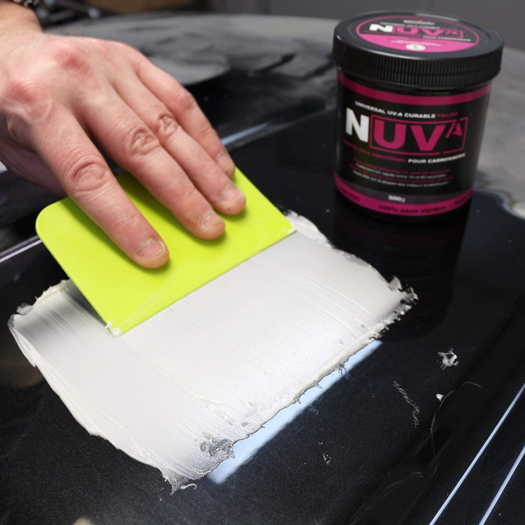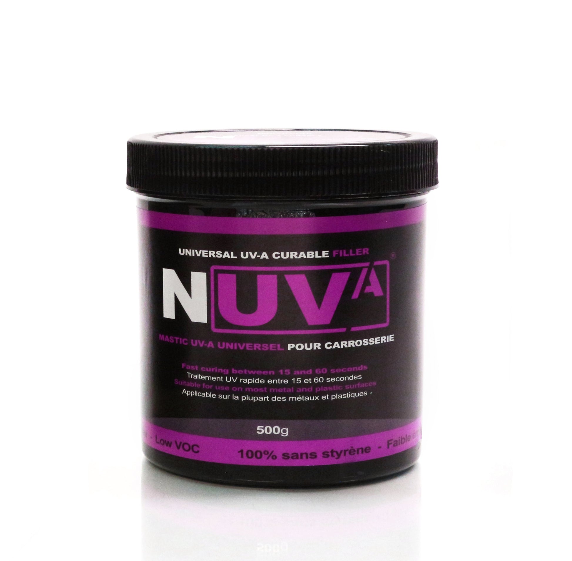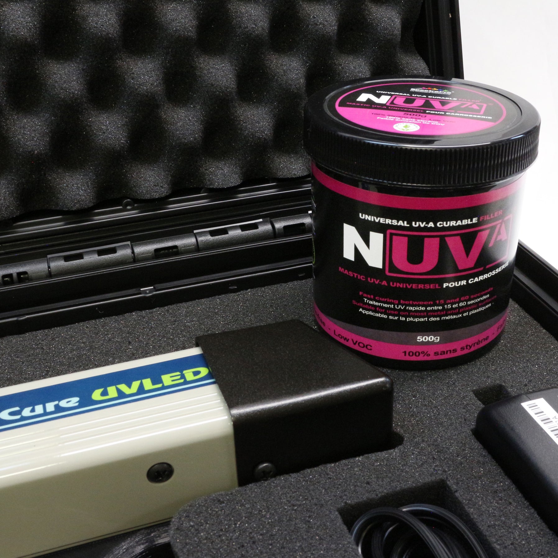 Universal 1K UV-A curable filler putty used for automotive refinishing and highly recommended for dents, cracks, scratches and rust holes. Complete and fast UV curing process between 15 and 60 seconds, depending on thickness applied. Excellent flexibility and adhesion. Eco-friendly with low VOC & Styrene-free.